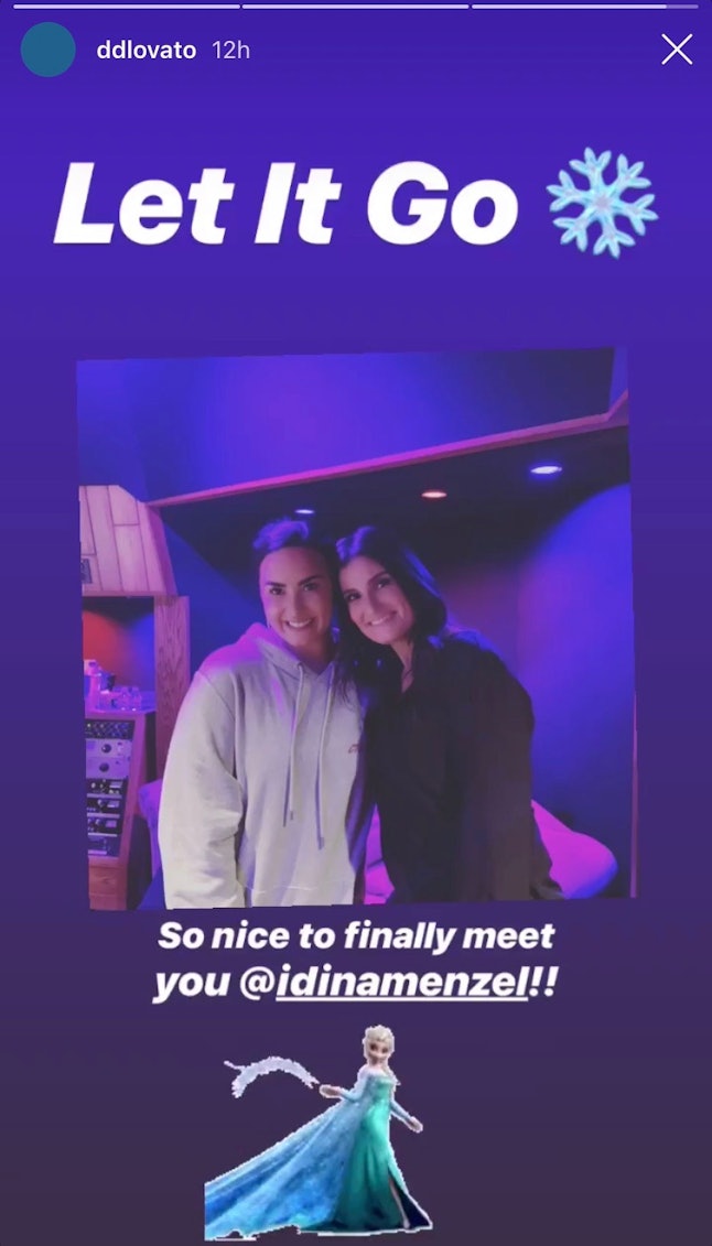 Sharing a photo of the two of them together on Tuesday, Menzel wrote “Ran into the beautiful and talented @ddlovato at the studio today!” In the photo, the two singers appear to be in a purple-lighted room, not a recording booth, so if you were hoping they were working on a collab, sadly that doesn’t seem to be the case. However, it’s still very good news.